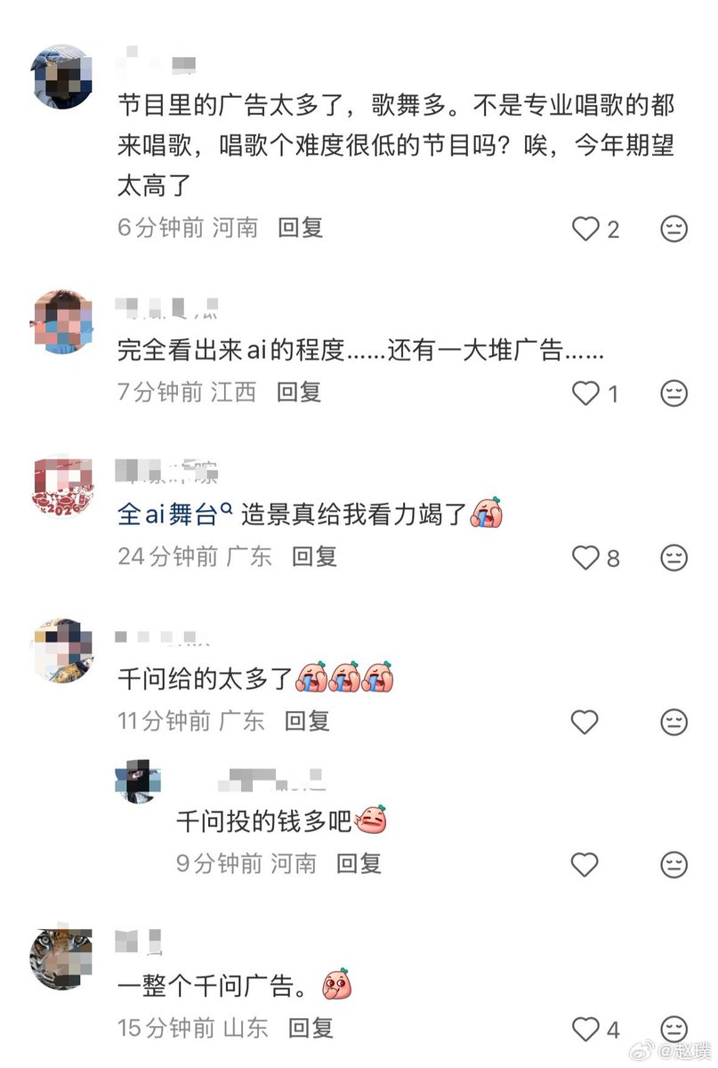 更令观众不满的是商业元素全面渗透。冠名商标识贯穿舞台,歌舞、机器人秀乃至脱口秀环节都被质疑“像广告展销”。叠加过度依赖AI特效,削弱了传统国风节目的感染力,弹幕刷屏调侃:“这是春晚,还是广告专场?”