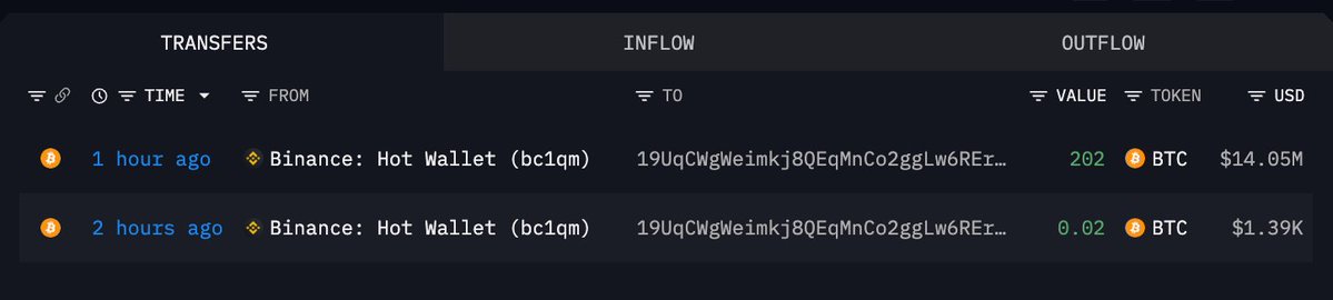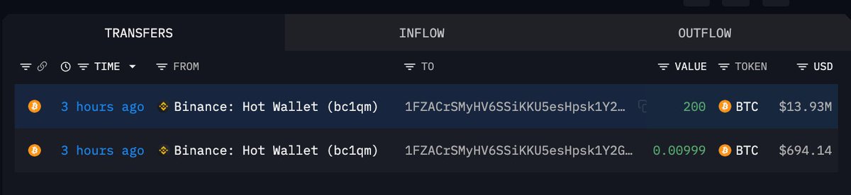 地址 1FZAC…GLKzD 和地址 19UqC…rFeDN 过去 3 小时从 #Binance 提出 402.02 枚 BTC,价值 2798 万美元,平均提出价格 $69609.68