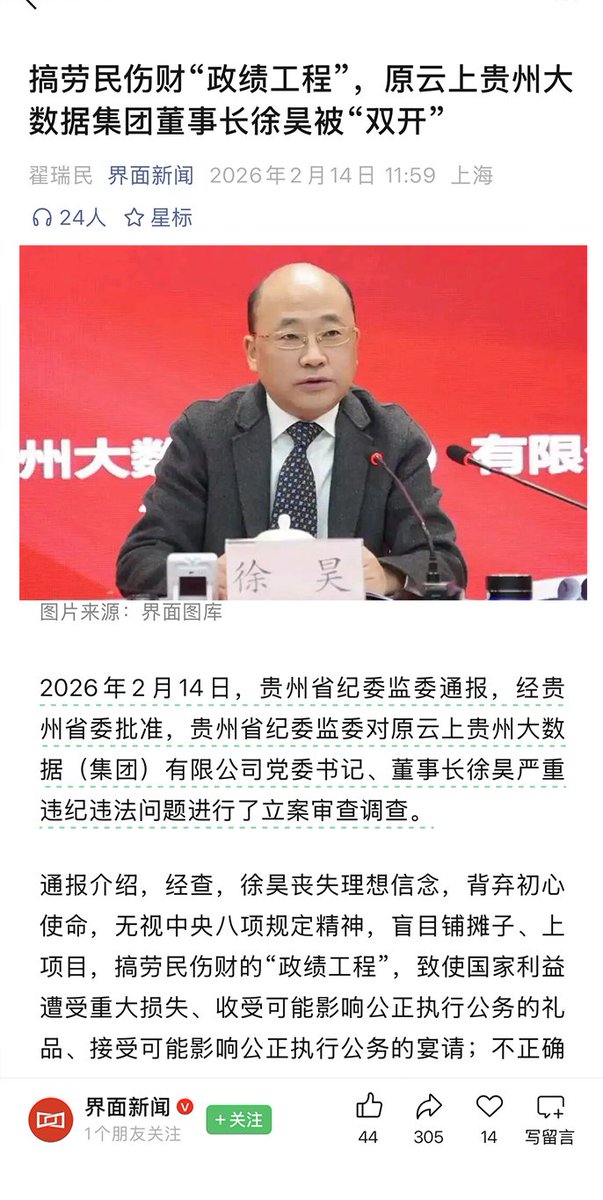 2月14日,根据《界面新闻》报道:贵州省纪委监委通报,经贵州省委批准,贵州省纪委监委对原云上贵州大数据(集团)有限公司党委书记、董事长徐昊严重违纪违法问题进行了立案审查调查。