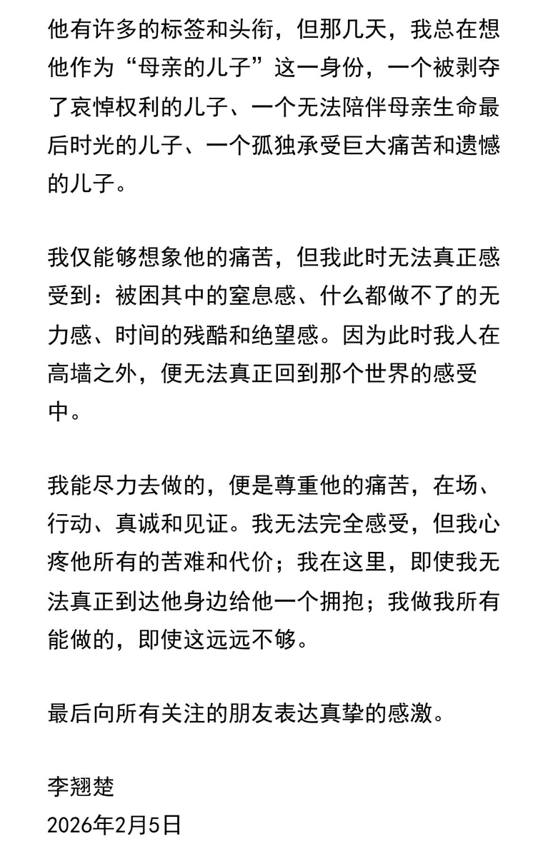 2026年2月2日上午,许志永的母亲段联真老人在河南开封溘然长世,服刑狱中志永与慈母相隔千百里,不能床前侍奉与送别。儿媳李翘楚于网发文悼念慈母,思念志永,倾诉衷肠(附图3、4),怎不让人心中落泪,黯然神伤......