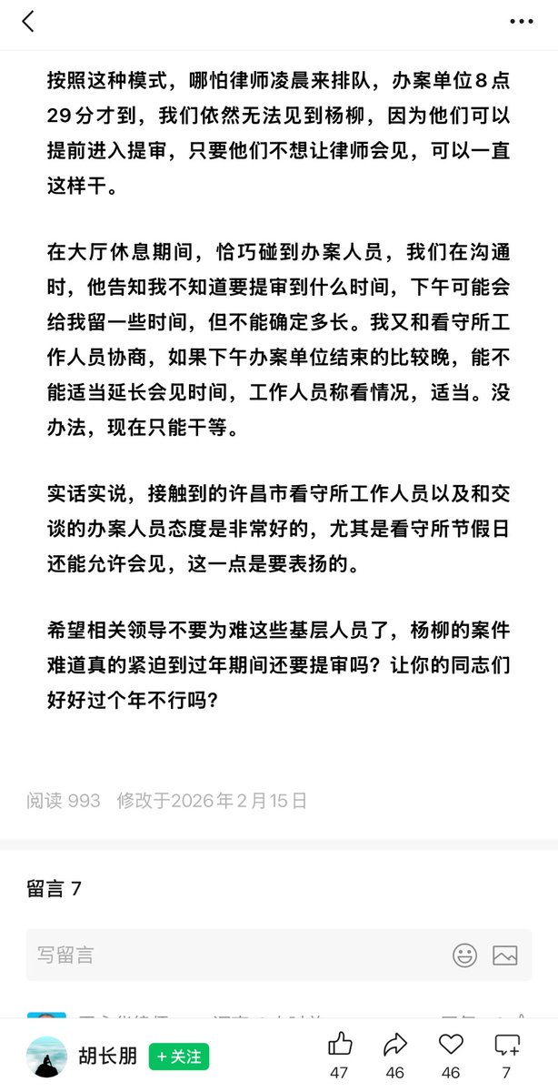 此后,2月13日、2月14日,以及今天,律师已连续三天前往许昌市看守所申请会见杨柳,但均未能见到当事人。