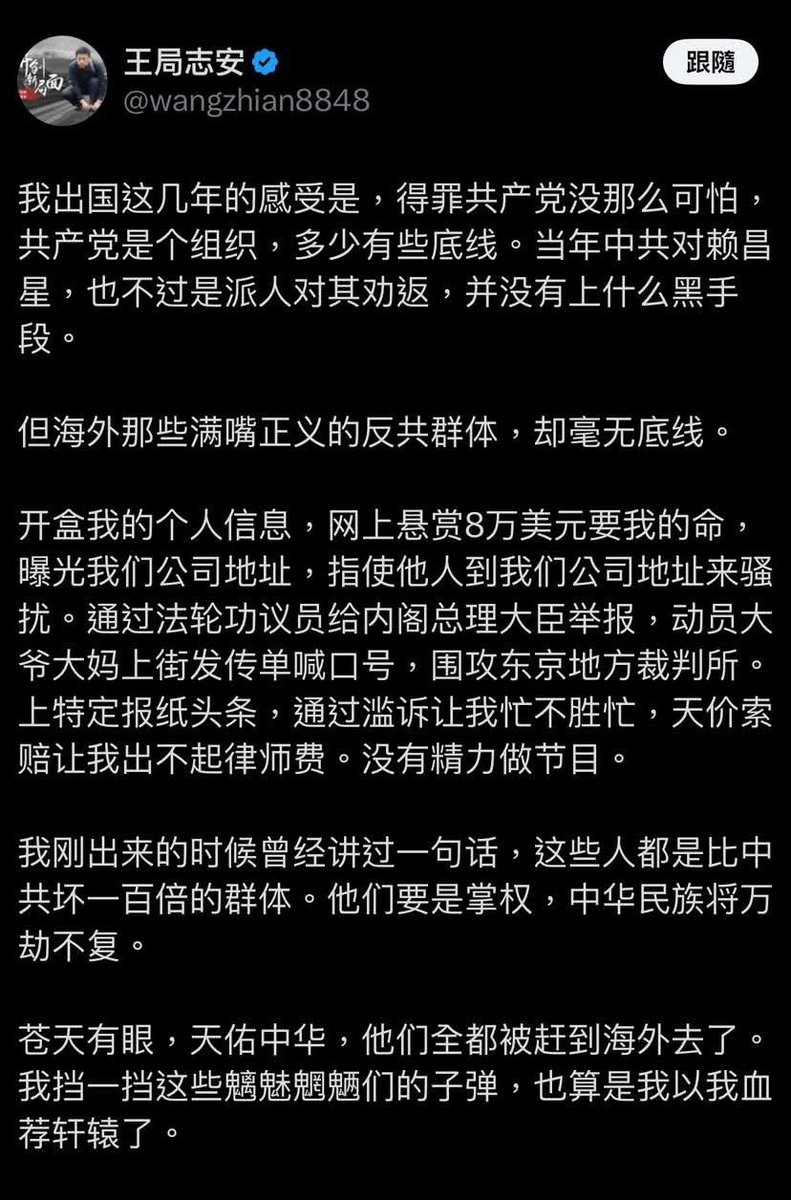 王志安是一個在日本的網紅,實際上他就是中共在海外的新型大外宣的典型代表。中共給他配備水軍,配備其他配套帳號。他的任務就是快速成為網紅,然後通過各種方法攻擊中共需要攻擊的人。他攻擊目標非常明確:反共的法輪功,在海外獨立反共的著名人士。比如陳光誠。即使去台灣他也是去宣揚中共攻台時台灣人立即投降。還特別侮辱民進黨的殘障人士。