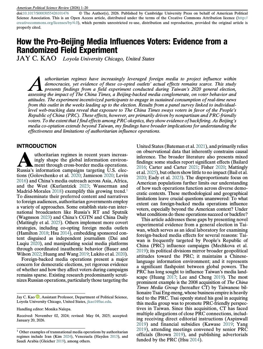一项发表于《美国政治学评论》(American Political Science Review)的最新研究指出,北京支持的台湾媒体在2020年台湾总统选举期间,确实对部分选民的政治态度和投票选择产生了影响。不过,这种影响主要集中在「无党派」及「本就对中国持较友好态度的选民群体」。