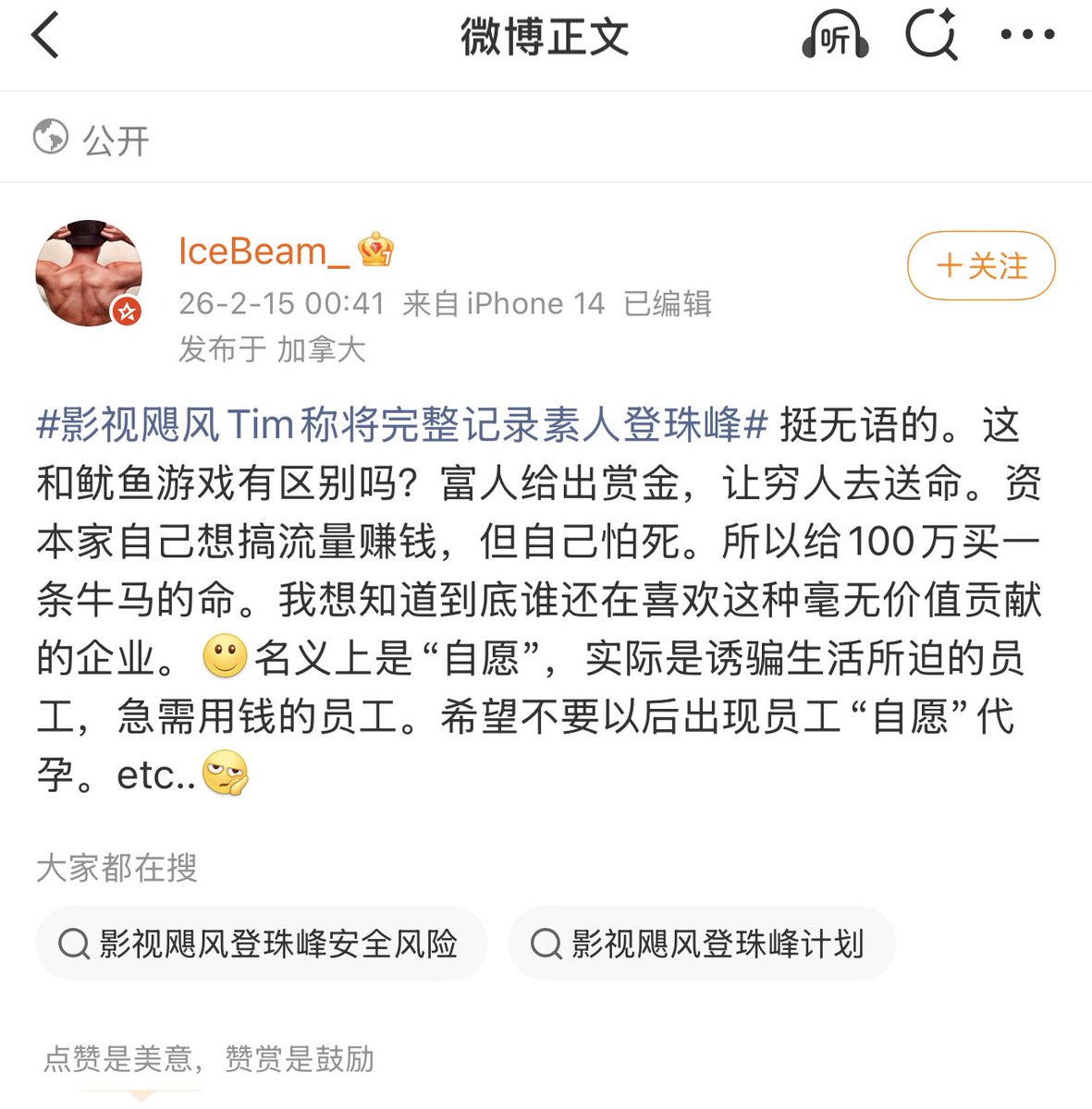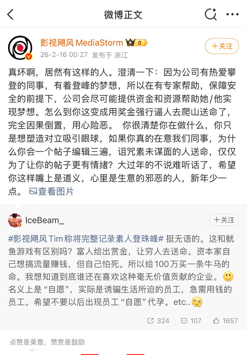 影视飓风回应:因为公司有热爱攀登的同事,有着登顶的梦想,而且有专家帮助,公司会在保障他安全的情况下,提供资金帮其实现梦想。怎么到你这里就变成用奖金强行逼人去爬山送命了,完全因果倒置,用心险恶。