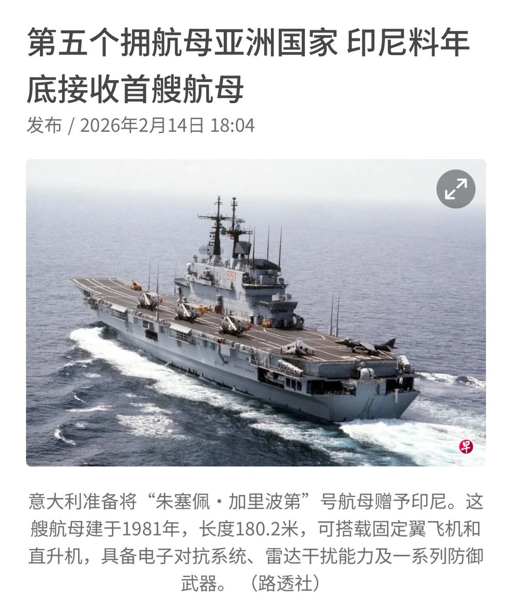 印尼购买了意大利退役的加里波第号航母,年底就接收,成为第五个操作航母的亚洲国家。