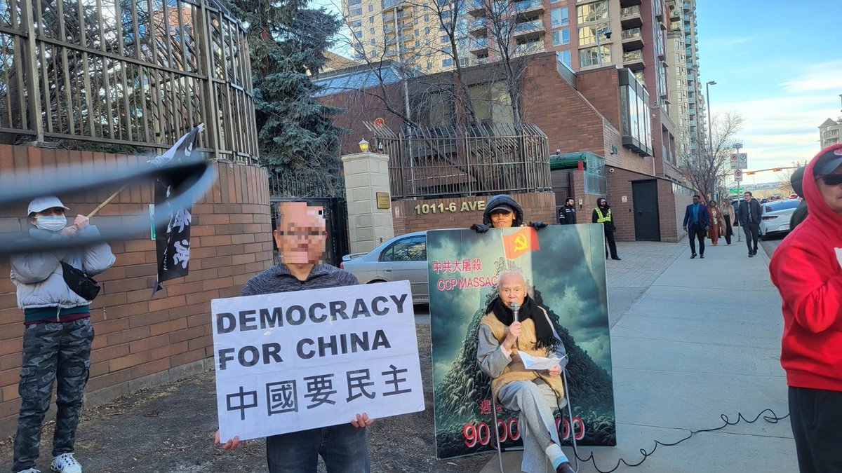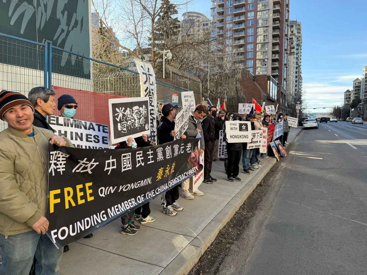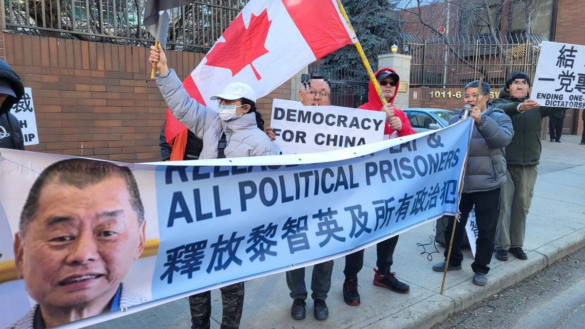 2026年2月15日,中国新年前夕,约50名卡加利市民到中领馆前示威,抗议中共重判香港壹传媒创办人黎智英。