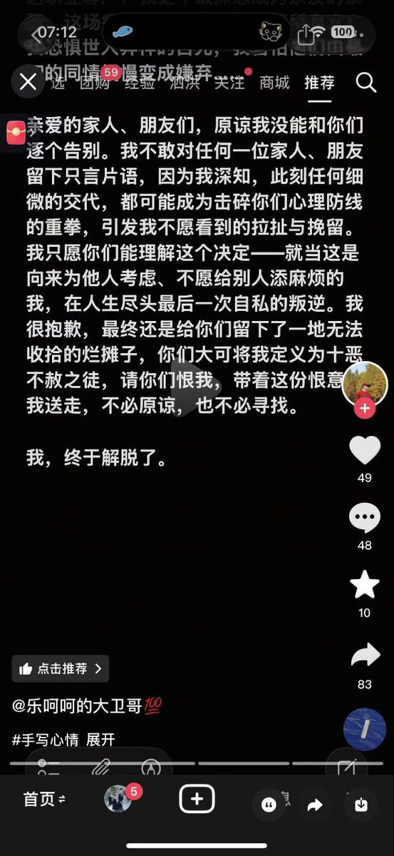 据悉,事后,学校联合政府部门对他的家人进行维稳,对他发布遗书的抖音平台封号(乐呵呵的大卫哥)