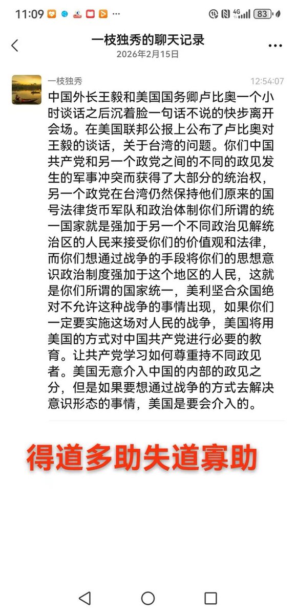 王毅和卢比奥会谈完后黑着脸出去了。卢比奥打开天窗说亮话,一针见血地揭露习近平所谓的“国家统一”的罪恶实质:即中共要不择手段地、包括不惜发动战争,宁可生灵涂炭也要把共产极权意识形态和极权制度强加于2300万台湾人民。