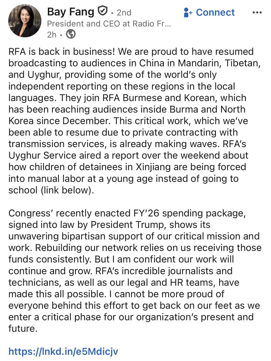 New: is “back in business” after Congress funding, says head Bay Fang