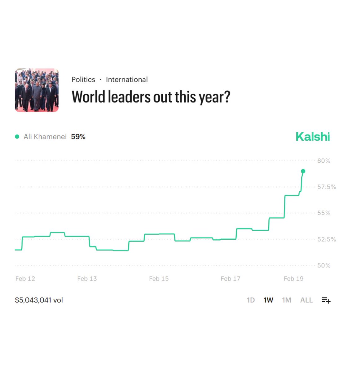 Chances of 🇮🇷 Iran's Supreme Leader being out of power this year rises to 59% according to prediction market.