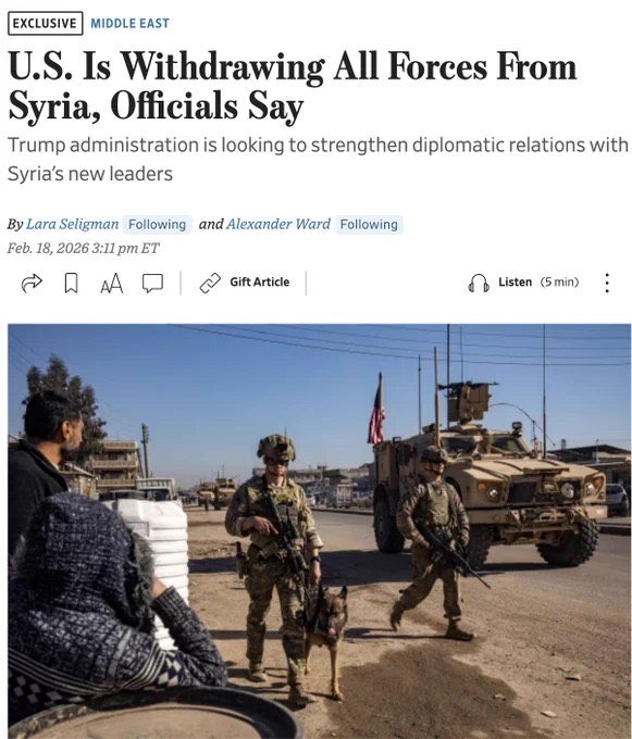 美国正从叙利亚撤出全部约1000名士兵,结束在该国长达10年的军事任务。据华尔街日报报道,部队已撤离关键基地,预计在两个月内完成全面撤军。川普政府认为,在叙利亚民主力量(SDF/YPG)基本解散并同意并入阿赫马德·沙拉总统领导下的叙利亚军队后,美国已无必要继续驻军。官员称此举与伊朗局势无关。