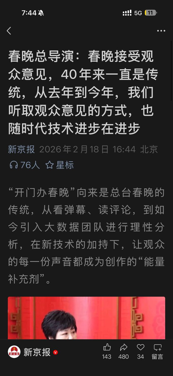 但 春晚总导演表示:春晚接受观众意见,40年来一直是传统,从去年到今年,从“看弹幕”、“读评论”,我们听取观众意见的方式,也随时代技术进步在进步