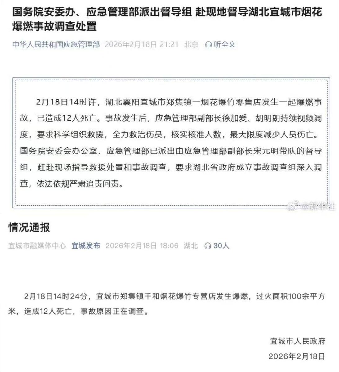 后续:据中国应急管理部消息,国务院安委会办公室、应急管理部已派出由应急管理部副部长宋元明带队的督导组,赶赴现场指导救援处置和事故调查,要求湖北省政府成立事故调查组深入调查,依法依规严肃追责问责。