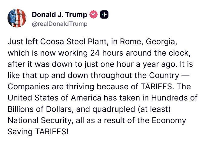 川普:刚离开乔治亚州罗马市的Coosa钢铁厂,该厂现已24小时全天候运转,而一年前仅运营一小时。全国各地都是如此——企业因关税而蓬勃发展。美国已收入数千亿美元,国家安全至少提升了四倍,这一切都归功于关税。