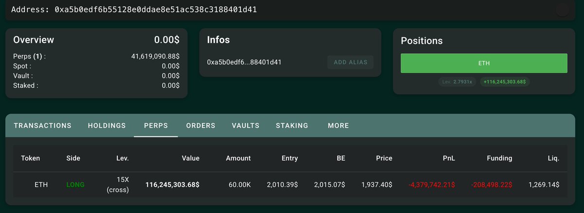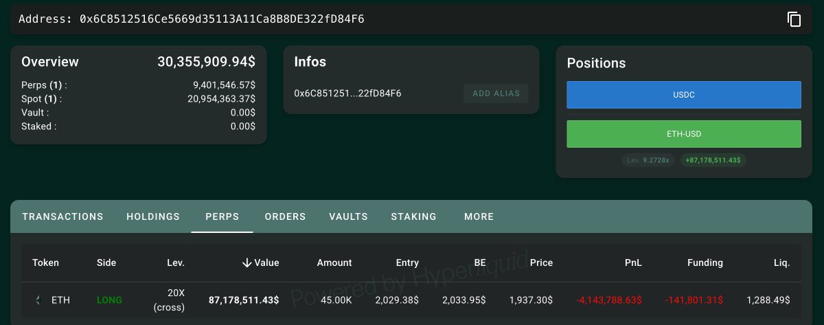 既昨天再次加仓 5 千枚后,目前两个地址共持有 10.5 万枚 ETH 的多单,总价值 2.03 亿美元,开仓价分别为 $2,029.38 和 $2,010.39,清算价为 $1,269.14 和 $1,288.49