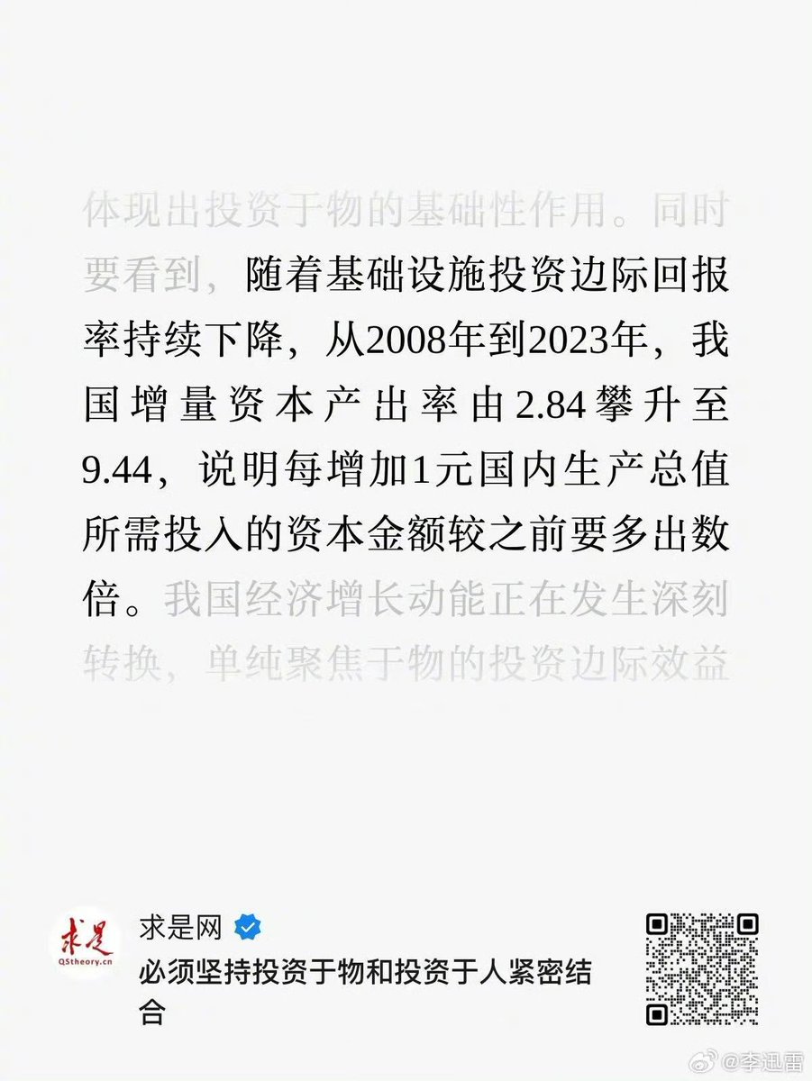 “随着基础设施投资边际回报率持续下降,从2008年到2023年,我国增量资本产出率由2.84攀升至9.44,说明每增加1元国内生产总值所需投入的资本金额较之前要多出数倍。”