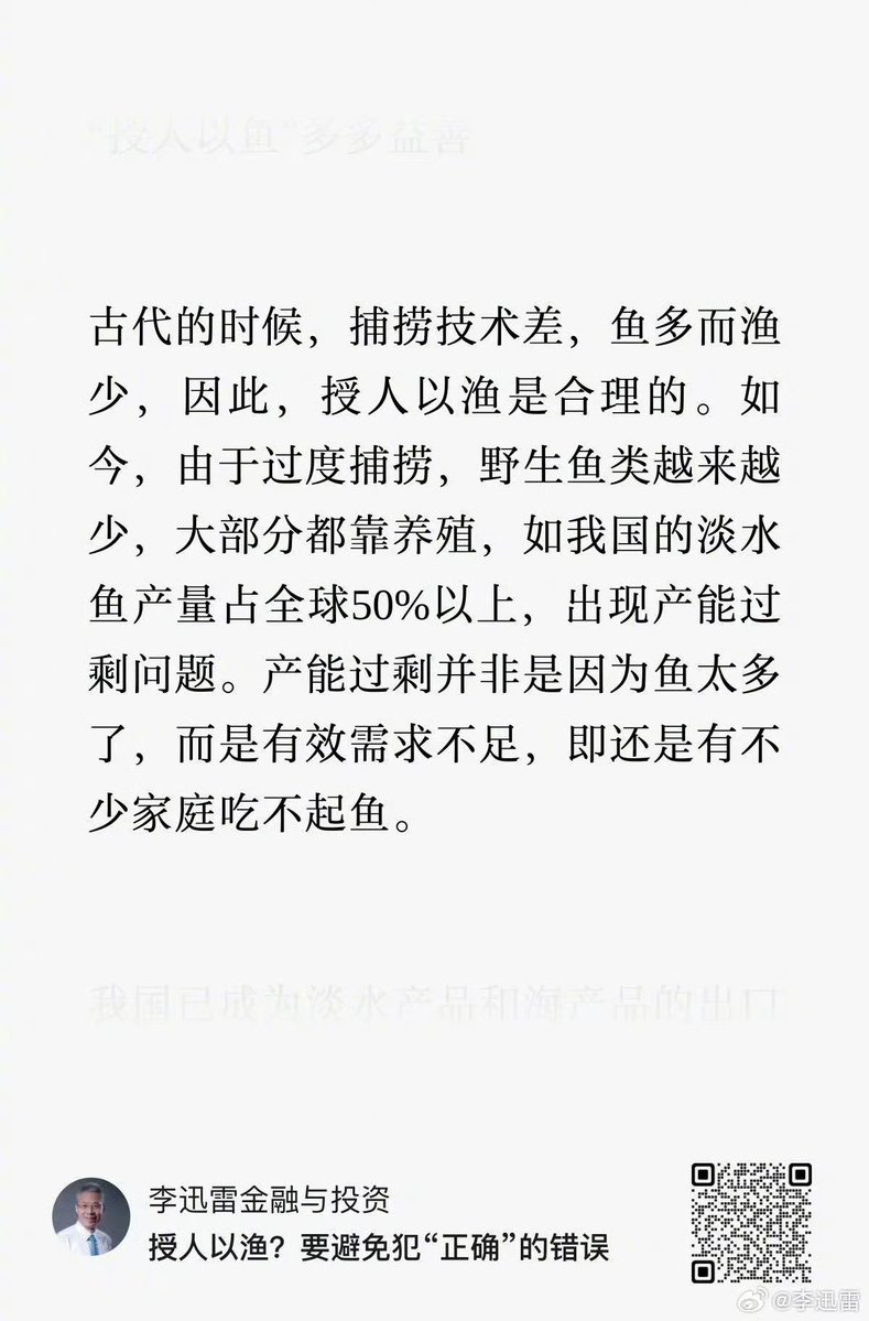 他在文中表示:古代的时候,捕捞技术差,鱼多而渔少,因此,授人以渔是合理的。如今,由于过度捕捞,野生鱼类越来越少,大部分都靠养殖,如我国的淡水鱼产量占全球50%以上,出现产能过剩问题。产能过剩并非是因为鱼太多了,而是有效需求不足,即还是有不少家庭吃不起鱼。