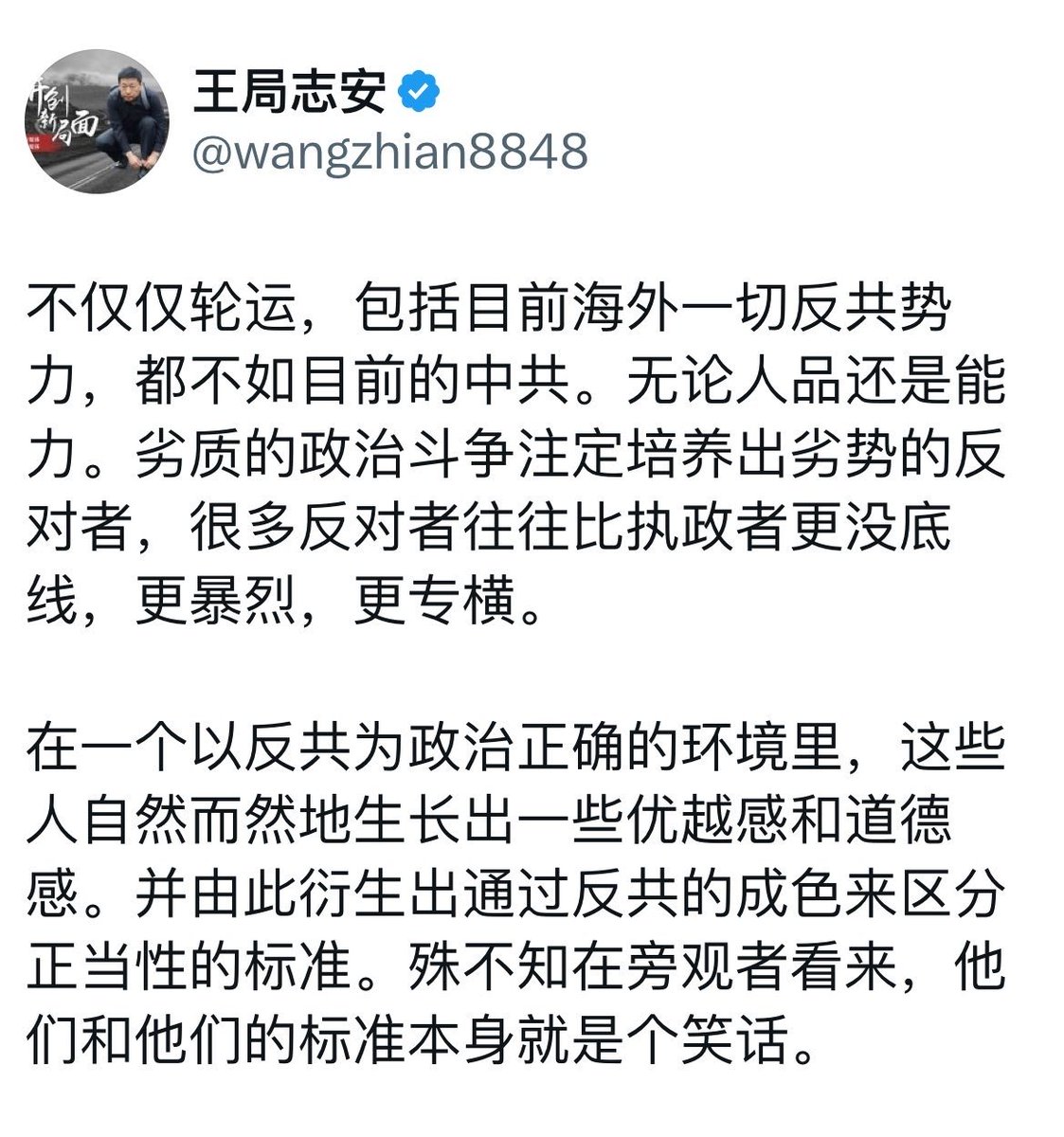 其实我觉得,以王志安为首的海外爱国大V们“反轮反民运反殖子”,其实一直以来都暗藏着一个不成文,但是很反常识的逻辑