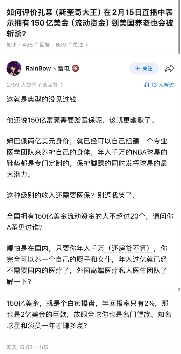 如何评价孔某(斯奎奇大王)在2月15日直播中表示,即便拥有150亿美金(流动资金)到美国养老也会被斩杀?