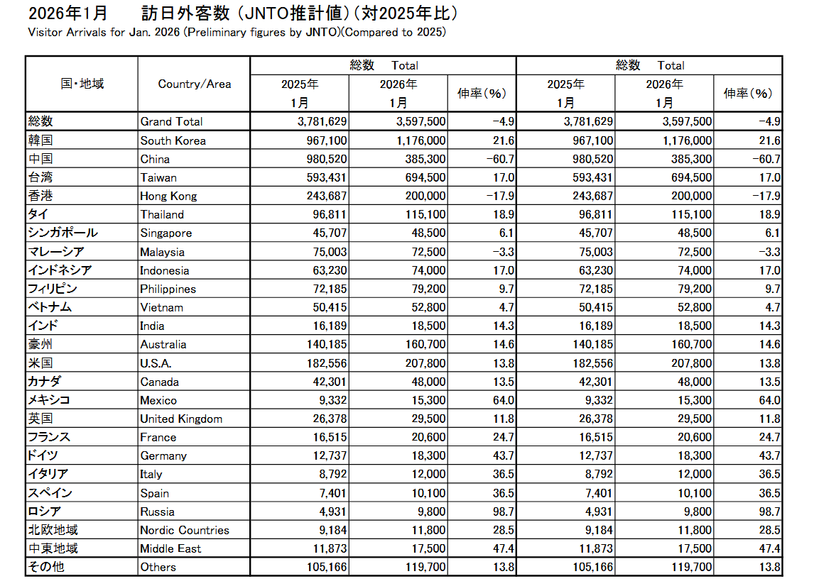 2月18日,日本政府观光局公布数据指出,今年1月访日旅客人数较去年同期减少4.9%至359.75人次,为四年来首度下滑。