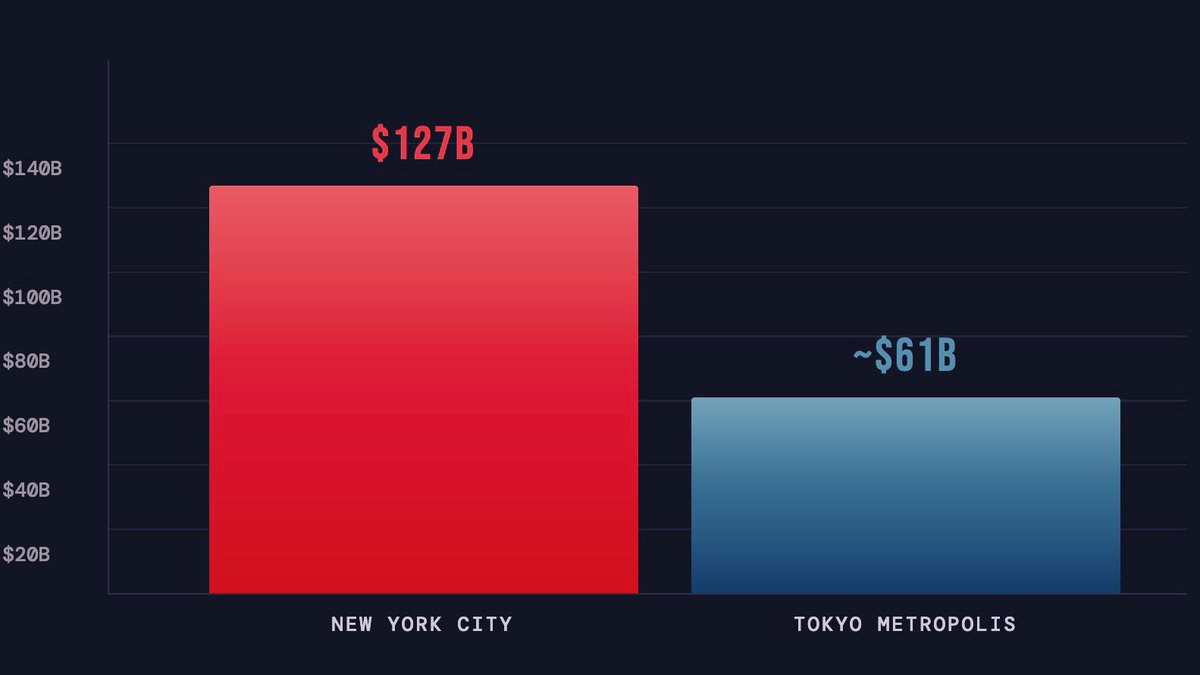 纽约市每年的预算高达 1270 亿美元,足足是东京(约 610 亿美元)的两倍。但讽刺的是,东京在人口数量是纽约两倍的情况下,在城市治理上实现了全方位碾压:东京街道更整洁、公交系统更高效、犯罪率更低,而且几乎没有流浪汉问题,公共教育也优于纽约。