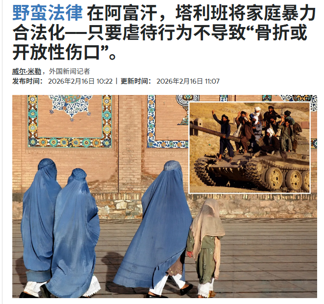 近日,据英国《太阳报》等多家国际媒体报道,阿富汗塔利班当局公布并实施一部新的刑法条款,其中涉及家庭暴力及女性行动自由等内容。 报道称,新规对家庭暴力行为作出具体界定:在未造成“骨折”或“明显开放性伤口”等严重伤害的情况下,丈夫对妻子的殴打行为可能不被视为严重刑事犯罪。 若造成较为严重的人身伤害,涉事男子最高可被判处15天监禁。 此外,相关条款还对女性的行动自由作出限制。报道指出,已婚女性若未经丈夫许可频繁返回父母家中,可能面临最长3个月的监禁处罚。
