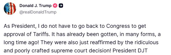 刚刚川普说身为总统,我无需再回头向国会寻求关税授权,相关授权早已以多种形式获得!最高法院那份荒谬拙劣的裁决也再次证实了这一点!