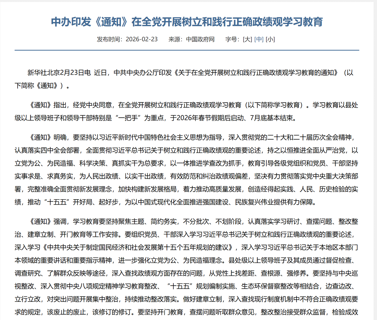 2月23日,新华社报道:中办印发《通知》,在全党开展树立和践行正确「政绩观」学习教育。