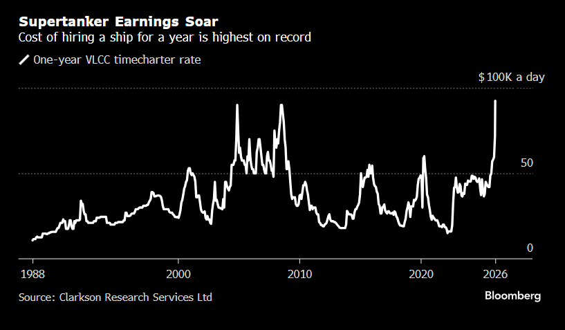 Bloomberg: The cost of hiring an oil supertanker for a one-year period has risen to an all-time high, reaching $92,000 per day.