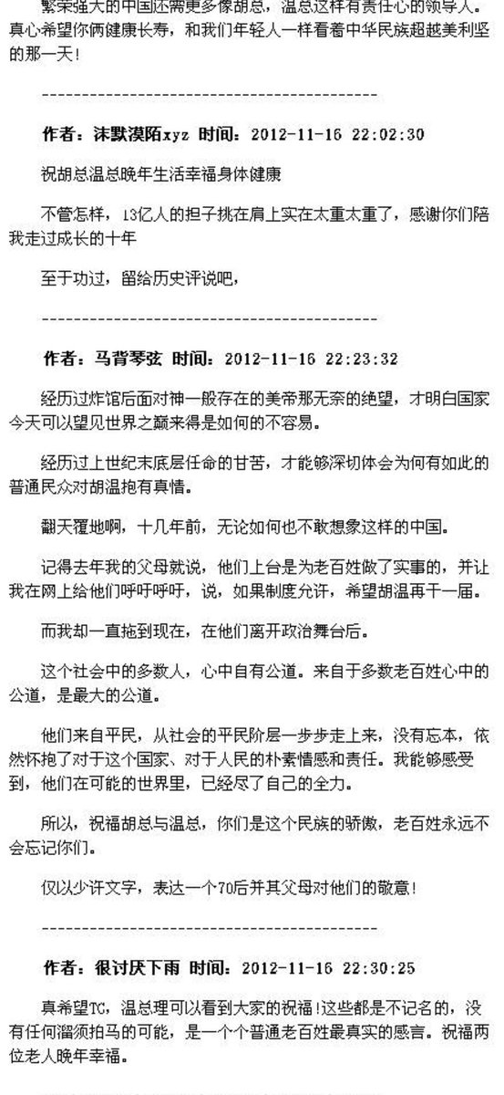 考古了2012年胡温即将卸任前,天涯论坛国际观察版块(简称国观,用户多数为男性,愤青居多,全球元首没有他们不骂的)网友们给即将卸任的二位的留言,原贴巨长无比,我只切了几张出来。原贴十多年前就没了,id也不用打码了。虽然这些留言只是沧海一粟,但都是具体的人真实的心声,借此一窥日月光华吧