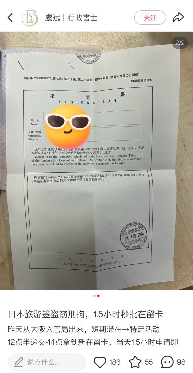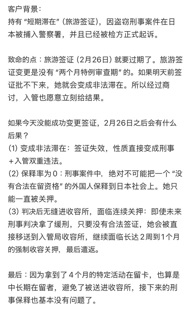 2月25日,一名中介发帖称,一名持日本旅游签证的中国游客,因为盗窃刑事案件在日本被捕,由于旅游签即将到期,最后这名游客成功拿到了4个月的特定活动在留卡。