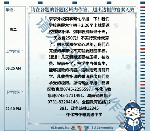 怀化市怀雅高级中学学生投稿:学校违规开学、乱收费补课。