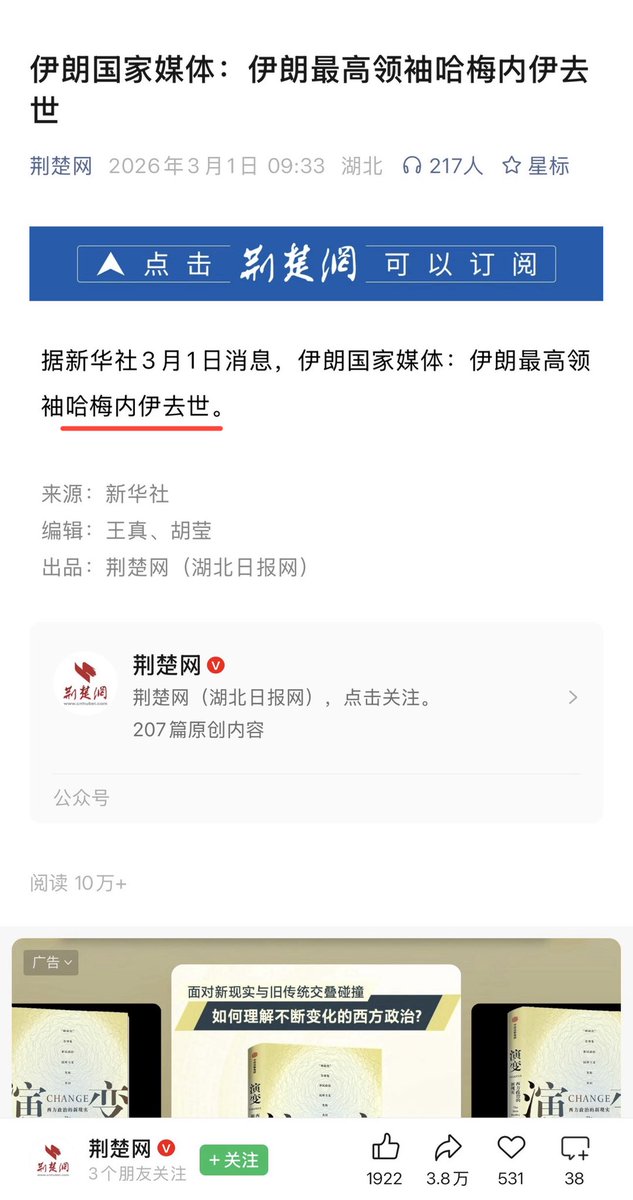 伊朗官媒说的是哈梅内伊“去世”,新华社照搬引用就可以了。