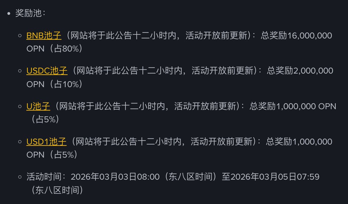 最新一期 Launchpool $OPN 首次使用 U 和 USD1 参与挖矿,FDUSD 则成为了过去式