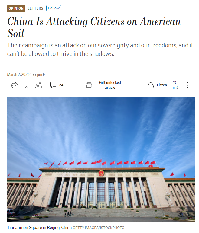 As highlighted in a bipartisan op-ed by @SenDanSullivan and @SenJeffMerkley, the CCP is targeting people living in the United States through threats, coercion, and hostage diplomacy.