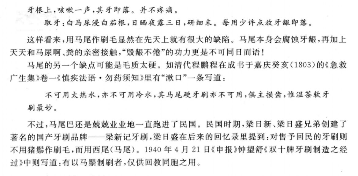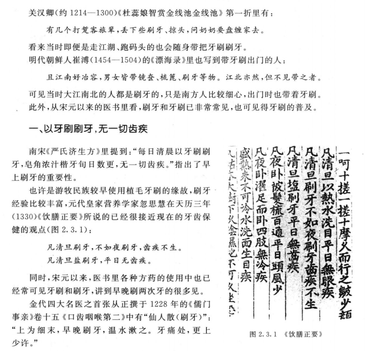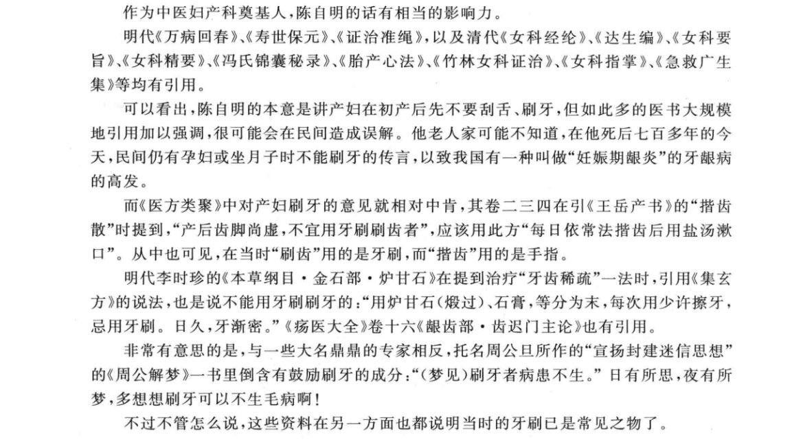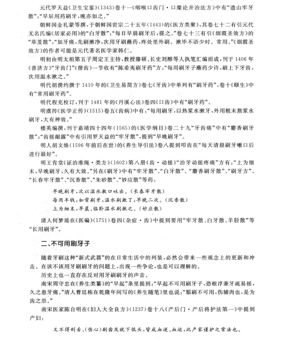 宋代之后,中国逐渐普及刷牙,很多医书鼓励早晚都刷一次牙,刷牙时不但要刷牙齿,也要刷舌苔,这些观念和现代已经很接近。但也有反对观点,《养生类纂》《养生随笔》就认为刷牙会导致牙根损伤,伤及齿肉,这可能和当时牙刷基本用的质地偏硬马尾做刷毛有关系。陈自明的《妇人良方大全》认为女人初产后先不要刮舌、刷牙,结果他的言论被其他书大规模引用,导致中国一直有一种叫“妊娠期牙龈炎”的疾病高发。到民国时代,中国普及使用猪鬃作为刷毛,不过回民用不得,依旧用的马尾马鬃。