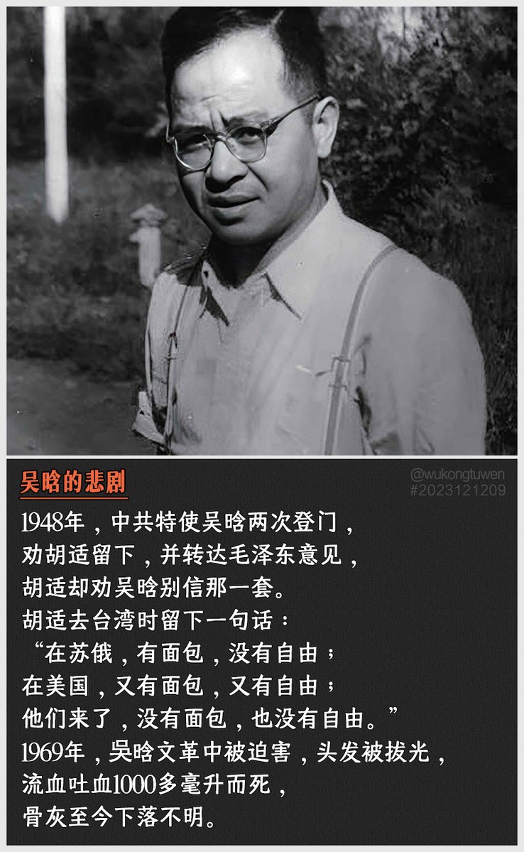 1948年,中共特使吴晗两次登门, 劝胡适留下,并转达毛泽东意见, 胡适却劝吴晗别信那一套。 胡适去台湾时留下一句话: “在苏俄,有面包,没有自由; 在美国,又有面包,又有自由; 他们来了,没有面包,也没有自由。” 1969年,吳晗文革中被迫害,头发被拔光, 流血吐血1000多毫升而死, 骨灰至今下落不明。