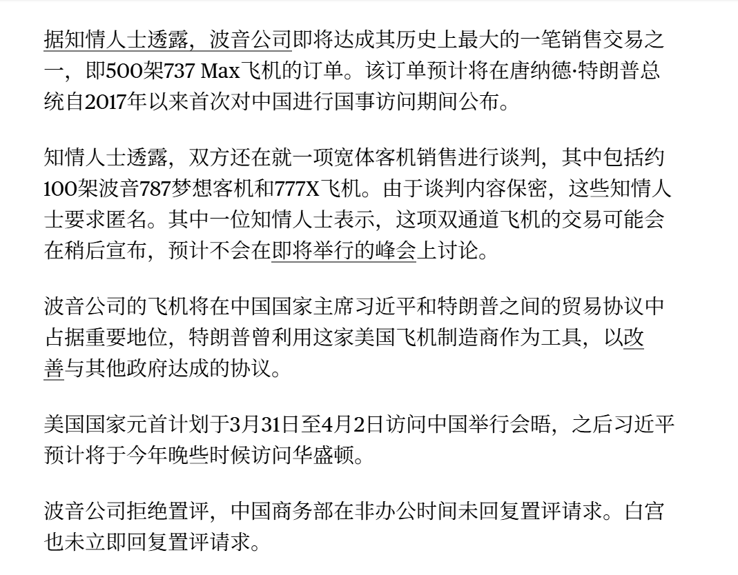 3月7日,彭博社报道,习近平送给特朗普的访华大礼包:约500架波音737MAX客机。