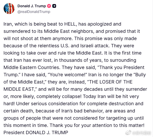 『伊朗正在被打得一败涂地,已经向其中东邻国道歉并投降,并承诺今后不再向他们开火。之所以做出这个承诺,只是因为美国和以色列持续不断的军事打击。他们原本想要接管并统治整个中东。这是几千年来,伊朗第一次败给周边的中东国家。