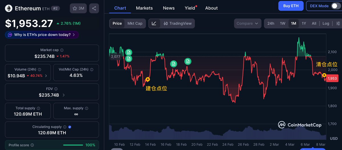止损了,三周前建仓 $ETH 的大户疑似在 3 小时前清仓离场,亏损 12.5 万美元🥲 地址 0x6ba…78468 曾在 02.13-02.14 以均价 $1971.98 从 #Binance 提出 4790.33 枚 ETH(约 944.6 万美元),持仓三周后以 $1945.85 充值进了币安;03.05 时曾一度浮盈 99.8 万美元 钱包地址 0x6ba13a785F4bBfAccd09100eA4c524a350078468