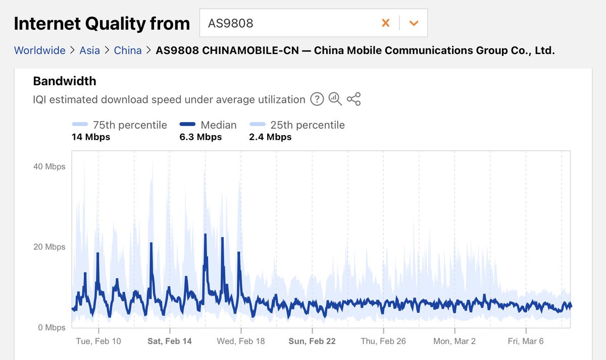 近日,据 Cloudflare Radar 的监测数据,过去一周中国大陆访问国际互联网的速度显著降低。Cloudflare 的互联网质量指数显示,自 2 月 19 日起,中国联通和中国移动的国际访问速度出现断崖式下滑,降至此前水平的大约一半。 此外,自 3 月 4 日起,中国电信的国际访问速度也出现类似情况,同样下降至原先的一半左右。而中国移动在 2 月 19 日首次下降后,近期又再次出现明显下滑,整体速度较此前水平进一步减半。