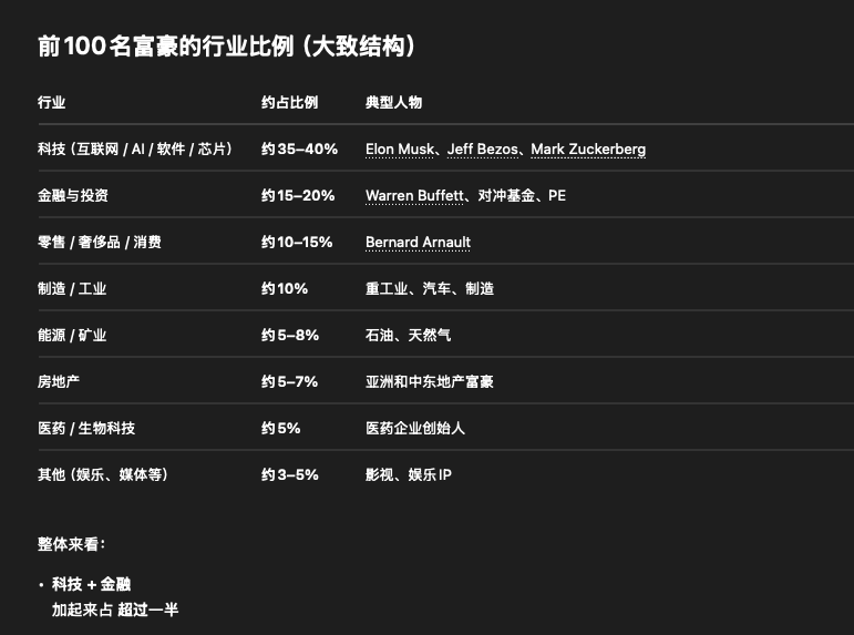榜单前列里很多财富增长都来自 AI 或 AI相关科技公司,Musk,Larry Page,老黄等人财富增长很大程度来自 AI浪潮带动的科技股上涨。例如 Alphabet 股价上涨直接推动 Page 和 Brin 财富大幅增加。