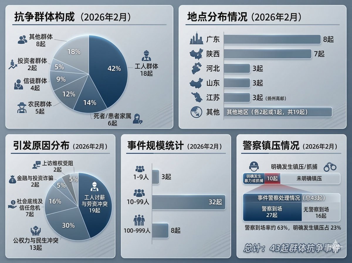 「中国群体抗争事件汇总(已发布部分)(2026年2月)」2026年2月份,共记录发生在中国的群体抗争事件 43 起。由于该月是中国的农历新年,群体抗争事件相对平时有所下降。