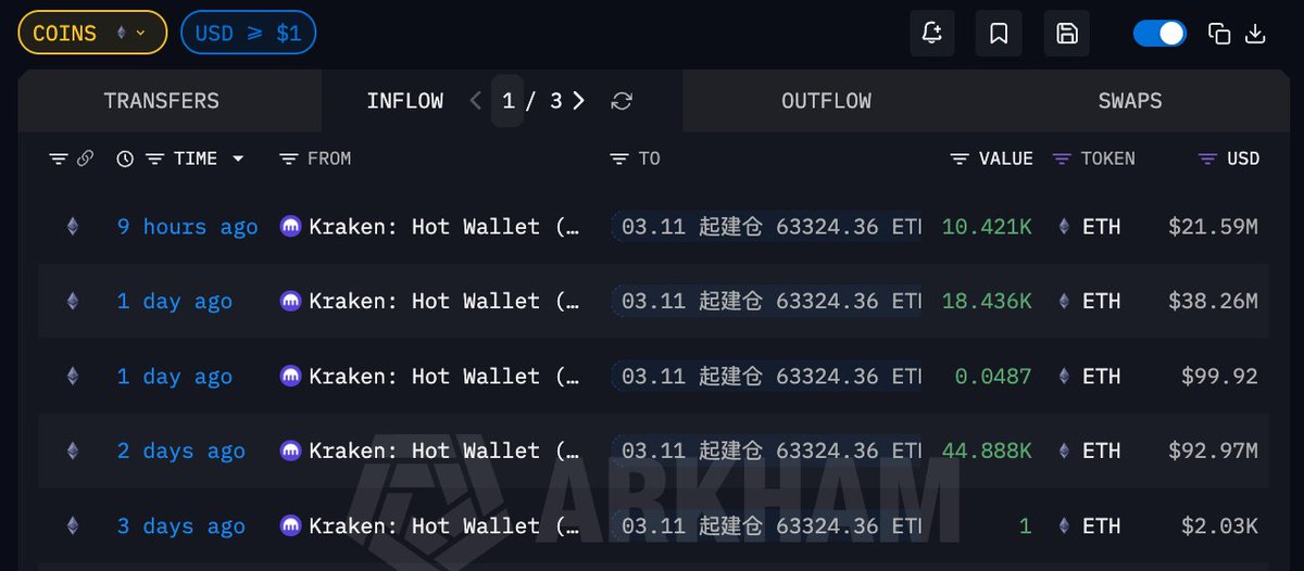03.11 起囤积 63324.36 $ETH 的巨鲸 9 小时前再次从 #Kraken 提出 10421 枚 ETH,价值 2159 万美元;目前他们建仓的 ETH 总价值 1.52 亿美元,平均提出价格 $2072.2,浮盈 404 万美元