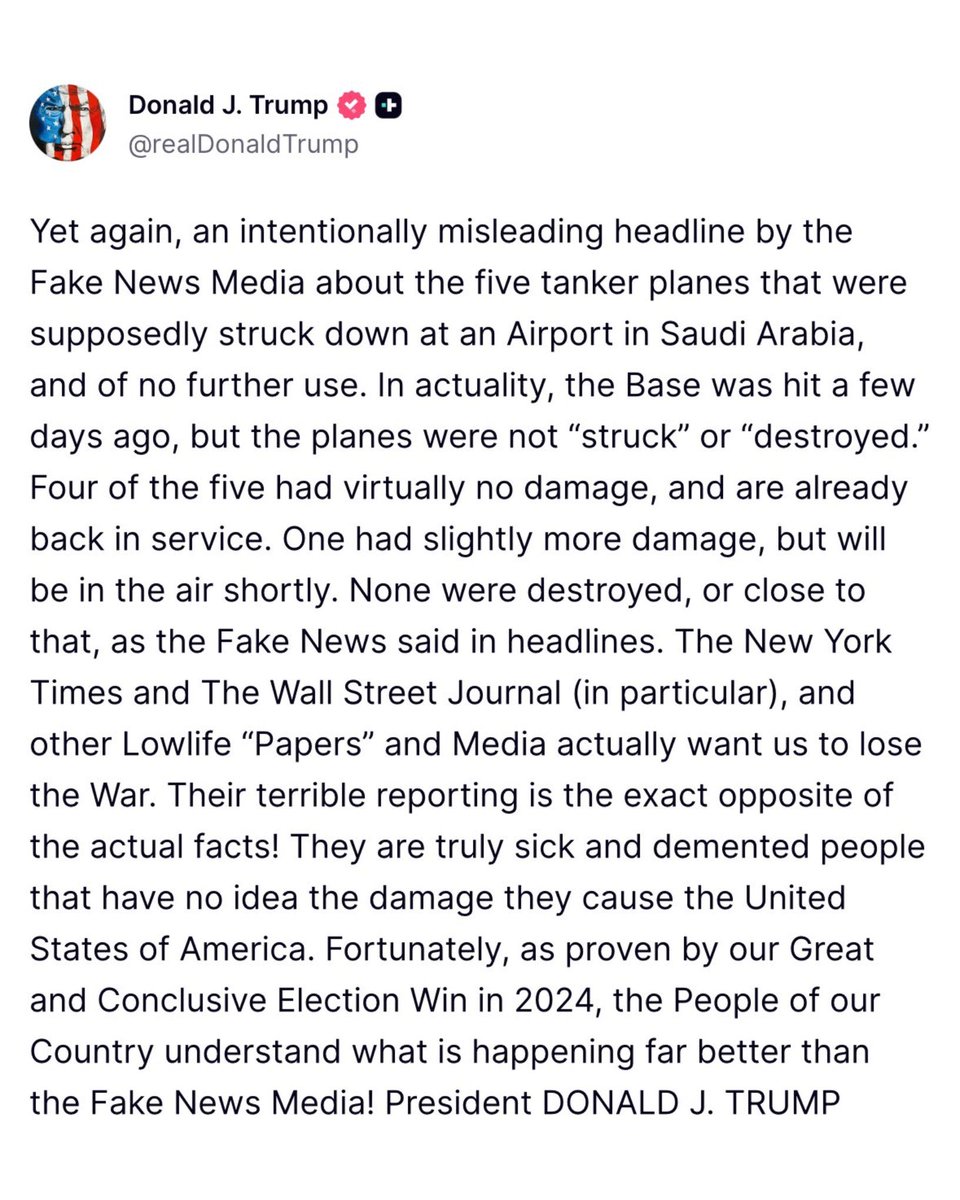 🚨 突发重磅:川普总统刚刚严厉抨击了那些散布亲伊朗宣传、企图以此打击士气的“假新闻”媒体!请您睁大眼睛看清楚那些假媒体假新闻包括一大批自媒体账号,都是在曲线欺骗你!凡是援引华尔街报,纽约时报的你都要特别保持警惕❗️