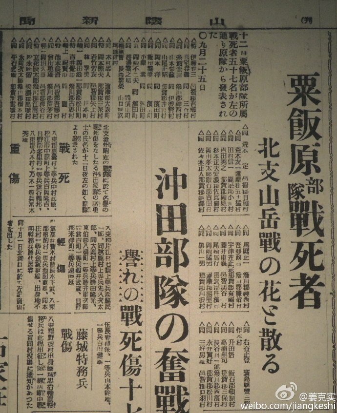 平型关大捷(1937年9月25日)真相平型关大捷 拉马车的辎重兵特务兵全部死亡者名单。共57名。去了一回岛根县调查,结果都清楚了。注:中共官方历次说法(屡有变动):早期宣传:歼敌"万余"后来修正:歼敌"三千余"近年较为保守的说法:歼敌"一千余"日方记录: