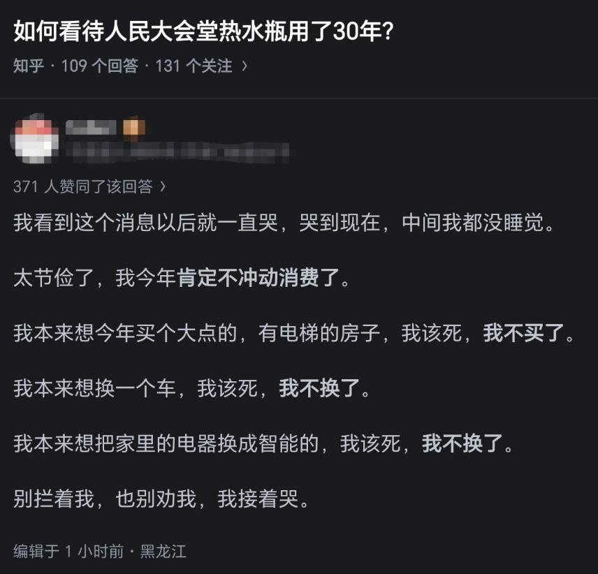 有知乎网友调侃,因为看到人民大会堂的热水瓶用了30年,决定今年不消费了。