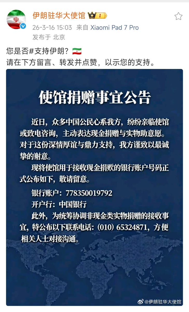 3月16日,伊朗驻华大使馆在微博和抖音都公布了账户地址,表示愿意接受民众的捐款。公告称:“近日,众多中国公民心系我方,纷纷亲临使馆或致电咨询,主动表达现金捐赠与实物助意愿。对于这份深情厚谊与鼎力支持,我方谨致以最诚挚的谢意。”但仅仅数小时后,伊朗驻华大使馆便删除了这则公告。