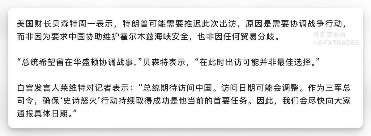美国财长贝森特表示,原因是需要协调战争行动,而非因为要求中国协助维护霍尔木兹海峡安全,也非因任何贸易分歧。
