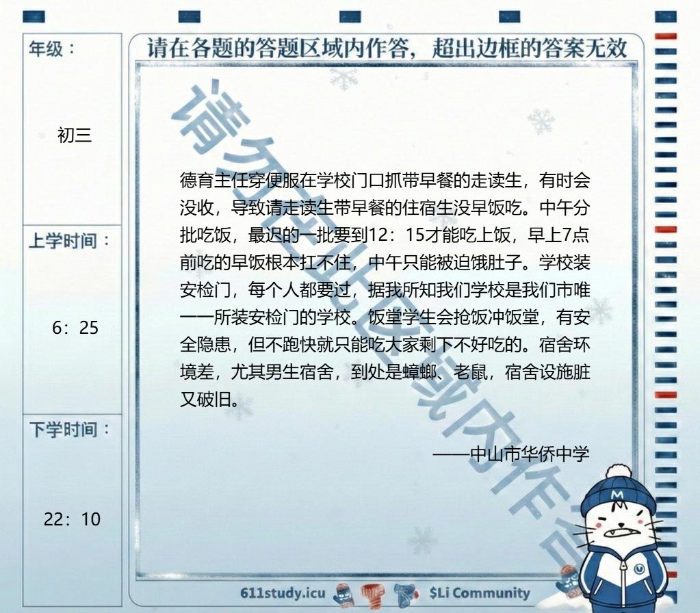 中山市华侨中学学生投稿:学校德育处主任在校门口检查学生是否携带早餐,导致不少学生无法正常进食,被迫空腹上课。此外,学校安装的安检门也引发一定安全隐患。与此同时,男生宿舍卫生状况堪忧,存在蟑螂、老鼠等问题。